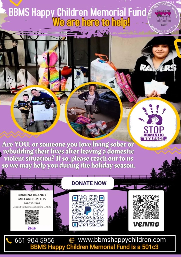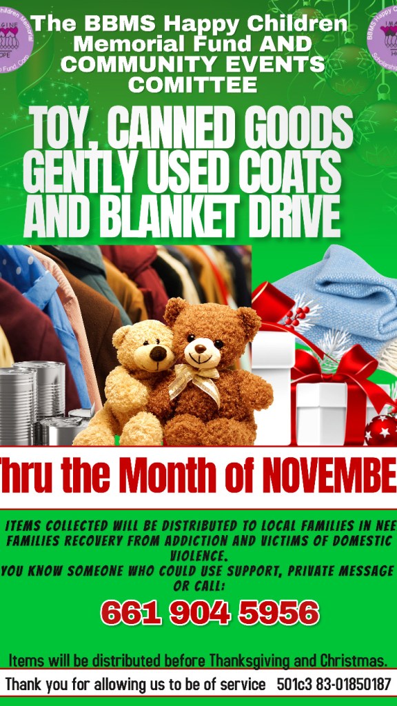 In the months of October and November, the BBMS Happy Children Memorial Fund will be collecting canned goods, toys, gently used coats and blankets. These items will distributed to local families in recovery from addiction and victims of domestic violence. Many of these families are in need of nonperishable items. In addition, toys will also be distributed to local needy families. As well as at our local elementary schools, Newhall Church of the Nazarene, and SC Child and Family Center.