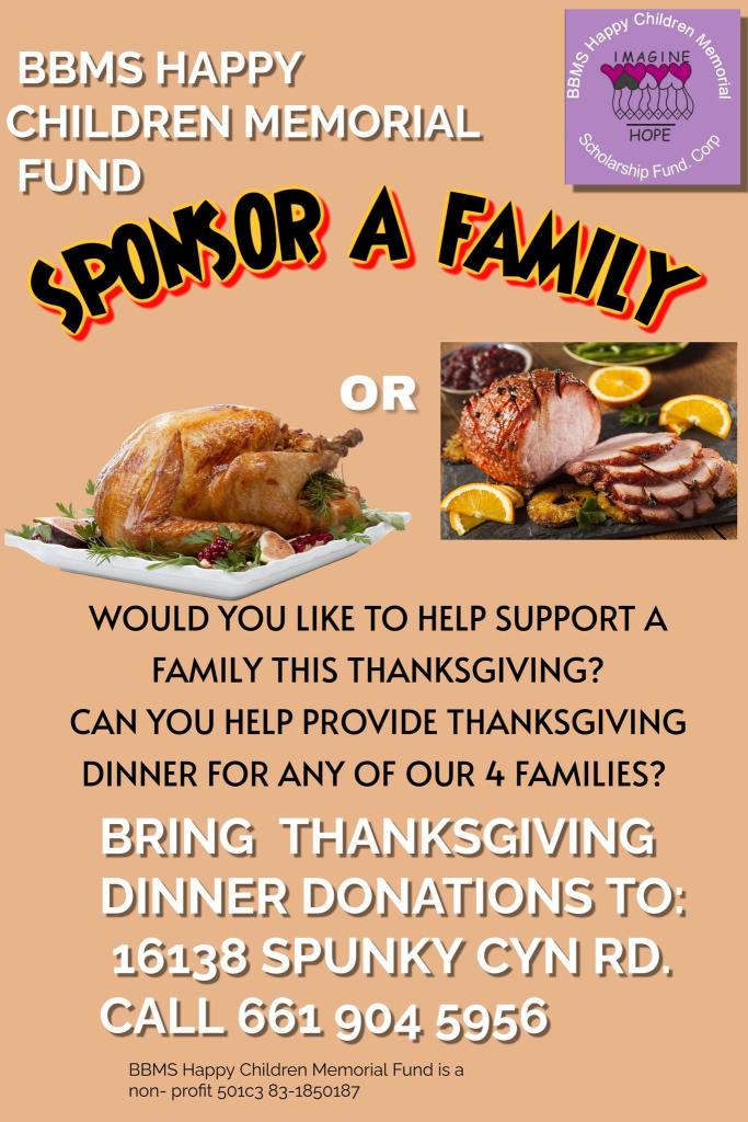 About sponsoring a family for Thanksgiving. BBMS Happy Children Memorial Fund provides Thanksgiving dinner for 3 families with your help. We need