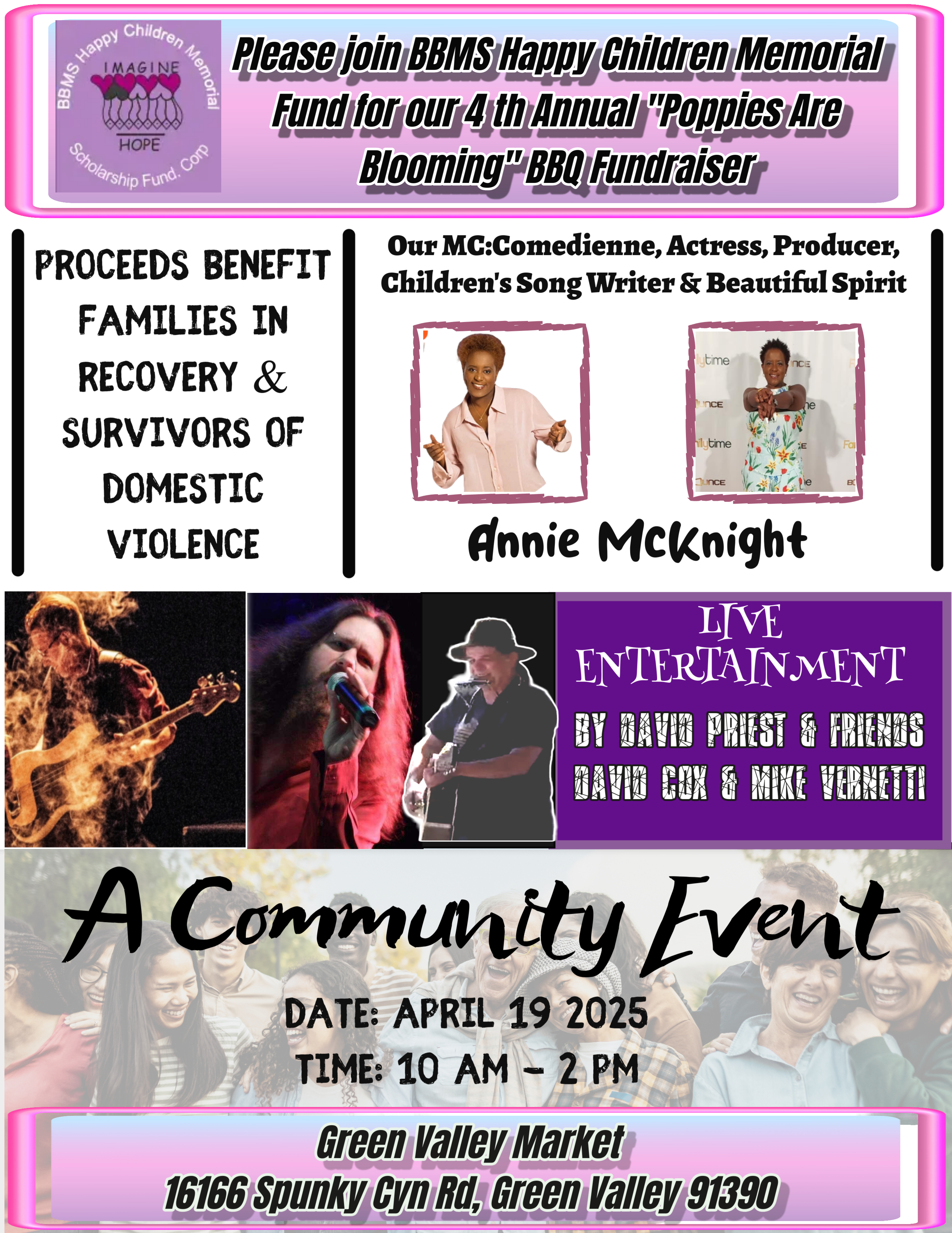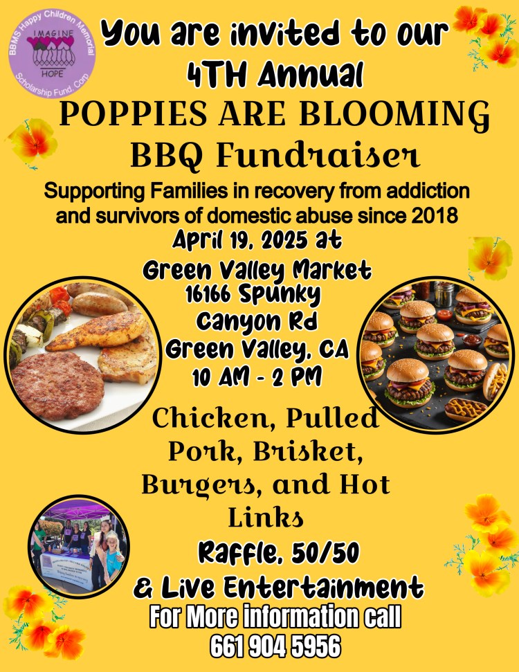 April 19, 2025, from 10-2 p.m., at the Green Valley Market, 16166 Spunky Canyon Rd, Green Valley, Ca. On the corner of San Francisquito Canyon Rd and Spunky Canyon Rd. We will have live entertainment, a 50/50 drawing, and raffle prizes. Stay and enjoy BBQ chicken, pulled pork, hot dogs or a burger and sides. Proceeds benefit families in recovery from addiction and survivors of domestic violence.