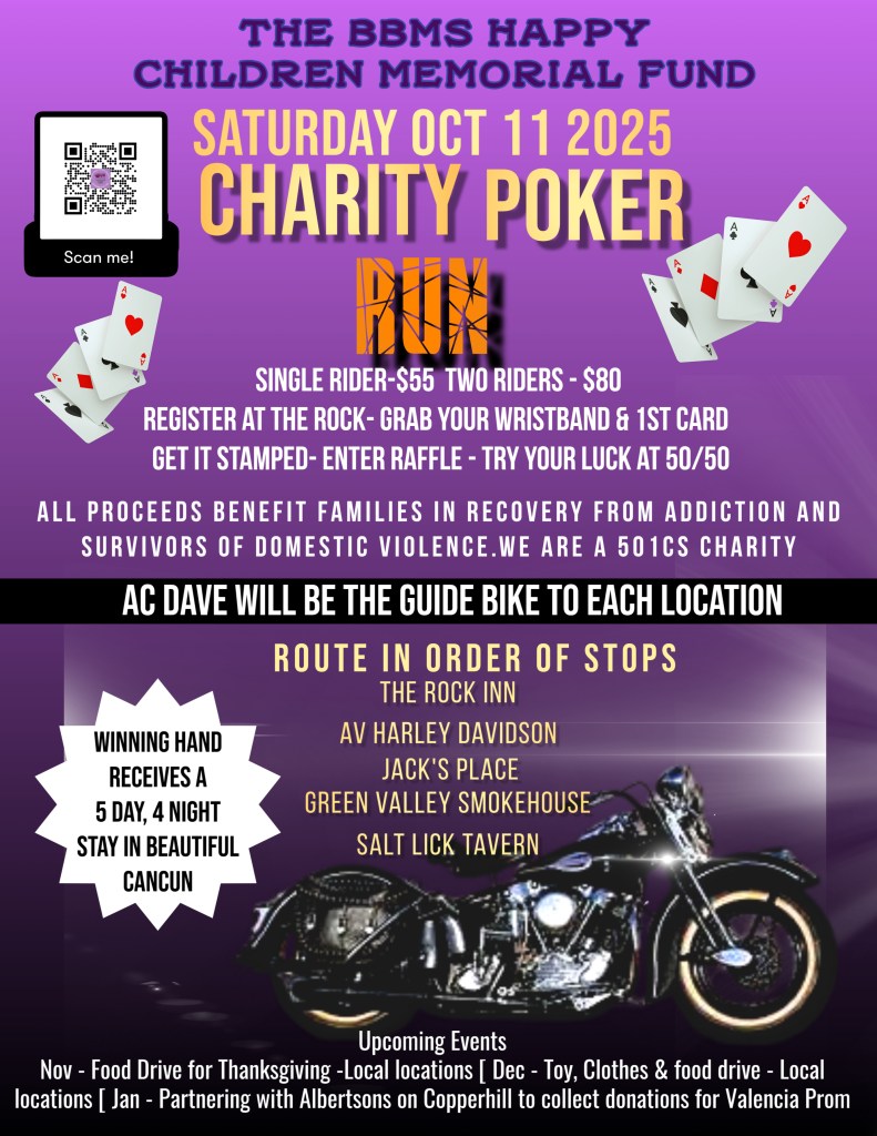 Join us October 11, 2025 BBMS Happy Children Memorial Fund is hosting a poker run to raise funds for families in recovery from addiction and survivors of domestic violence.